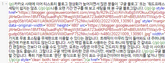 특히나 구글 블로그에서 지원하는 HTML 편집 모드는 들어가면 욕이 나올 수도 있습니다. 왜냐하면 한줄로 쫙 이어지는 코드로 작성되기 때문이죠.